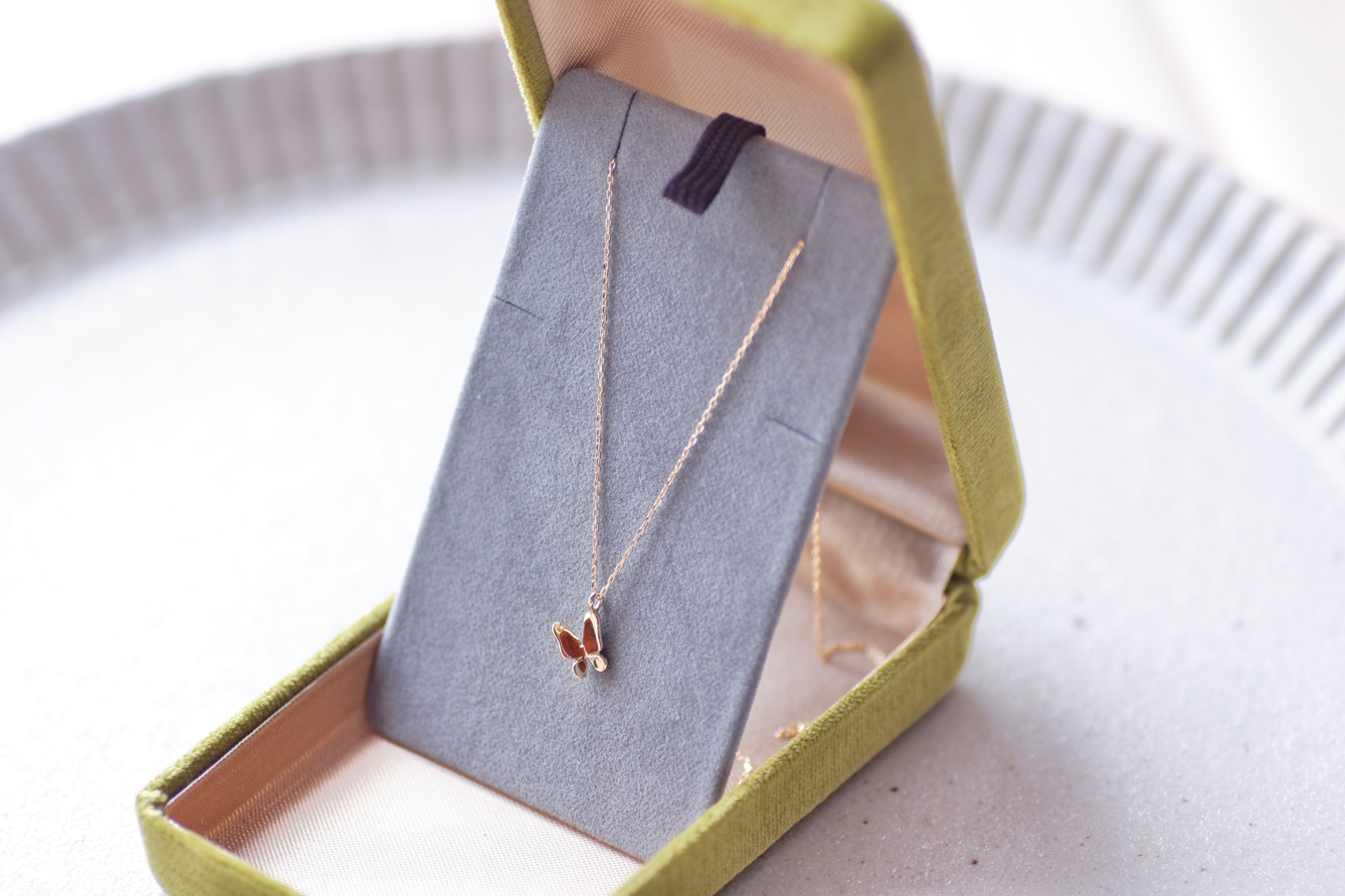 裏面に蝶の羽の模様を模した彫刻をしていますので、トップが裏返っても可愛いです。