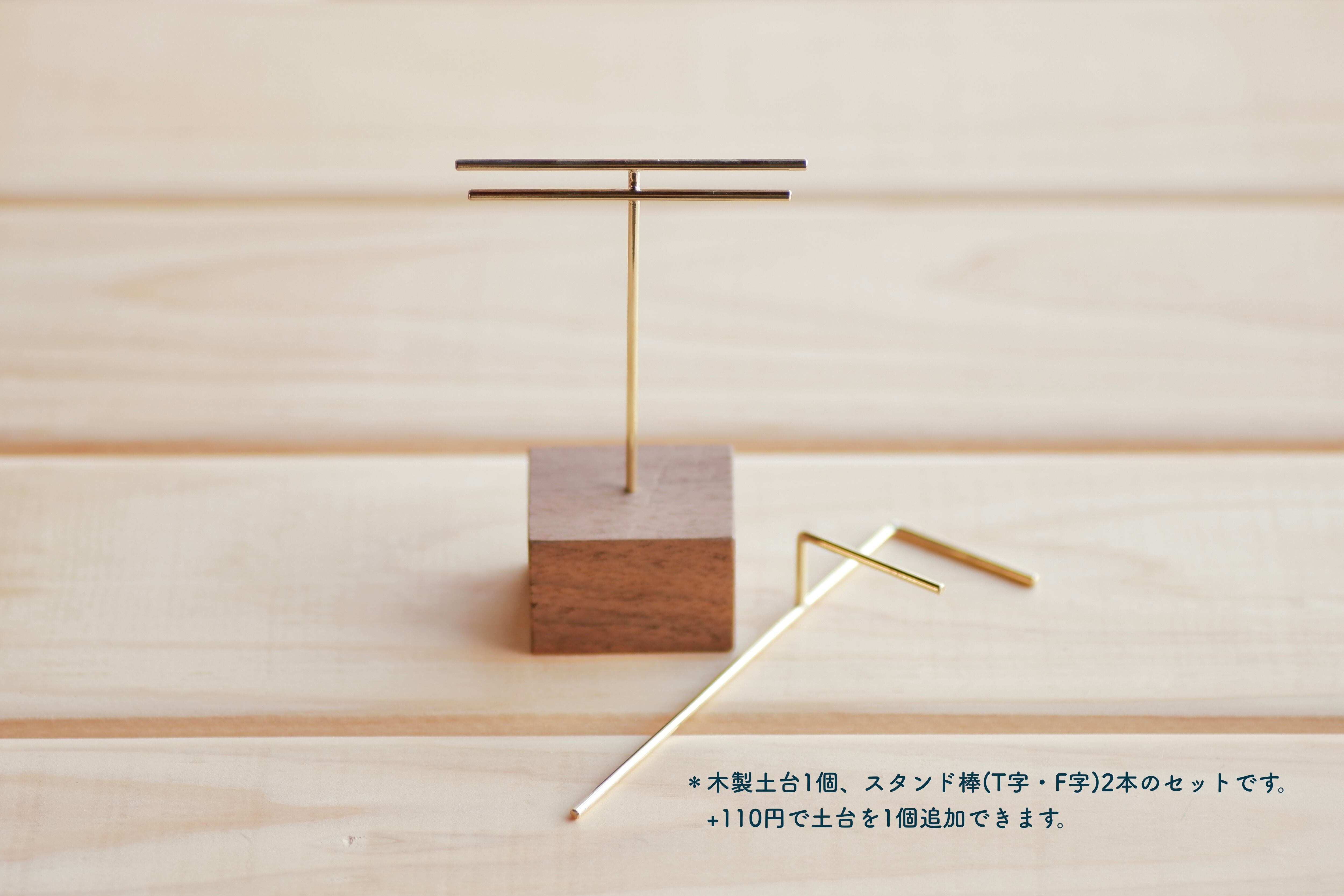 木製土台1個、スタンド棒(T字・F字)2本のセットです。